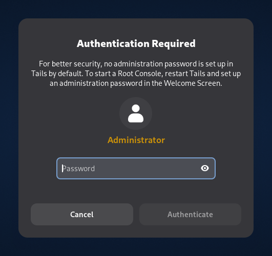 Improve the message when an administration password is required to open an application but no administration password was set in the Welcome Screen.